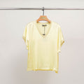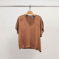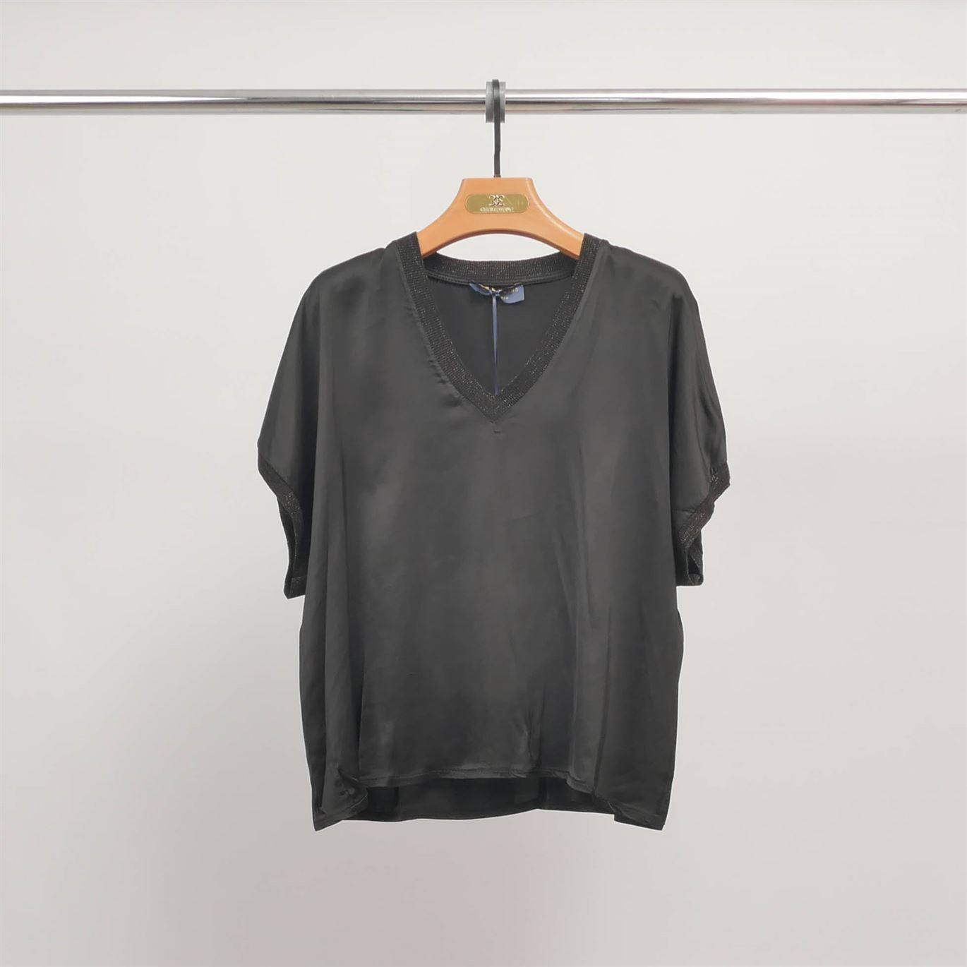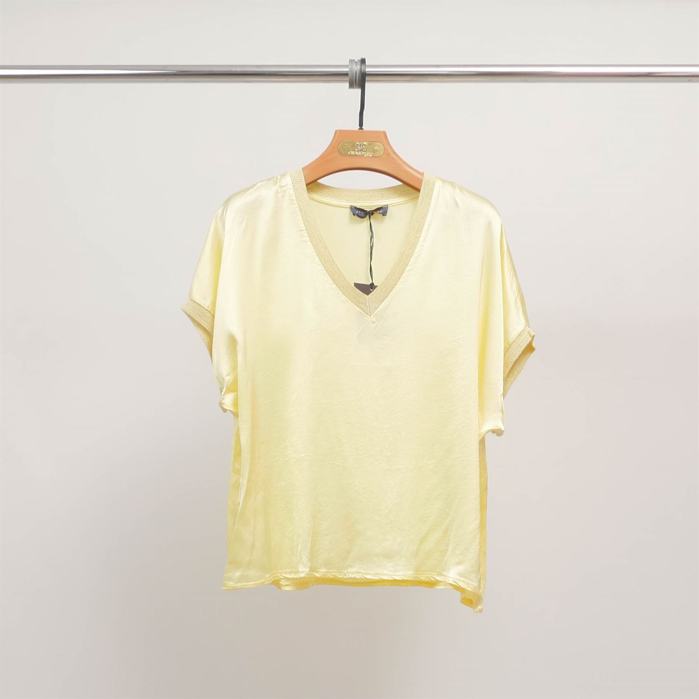 Ses manches courtes légèrement tombantes et sa coupe droite assurent un confort optimal, tandis que les bords en maille contrastante apportent une touche contemporaine. La matière associe douceur, brillance naturelle et élasticité pour un porté agréable en toutes circonstances.