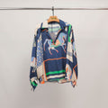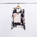 Sa coupe droite et légère est mise en valeur par un col chemisier à encolure ouverte sans boutons, des manches longues légèrement bouffantes resserrées aux poignets, et un ourlet subtilement arrondi. Le tissu satiné aux reflets discrets apporte une sensation de douceur et de légèreté tout en sublimant les couleurs vives et les motifs graphiques.