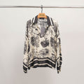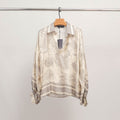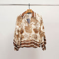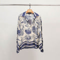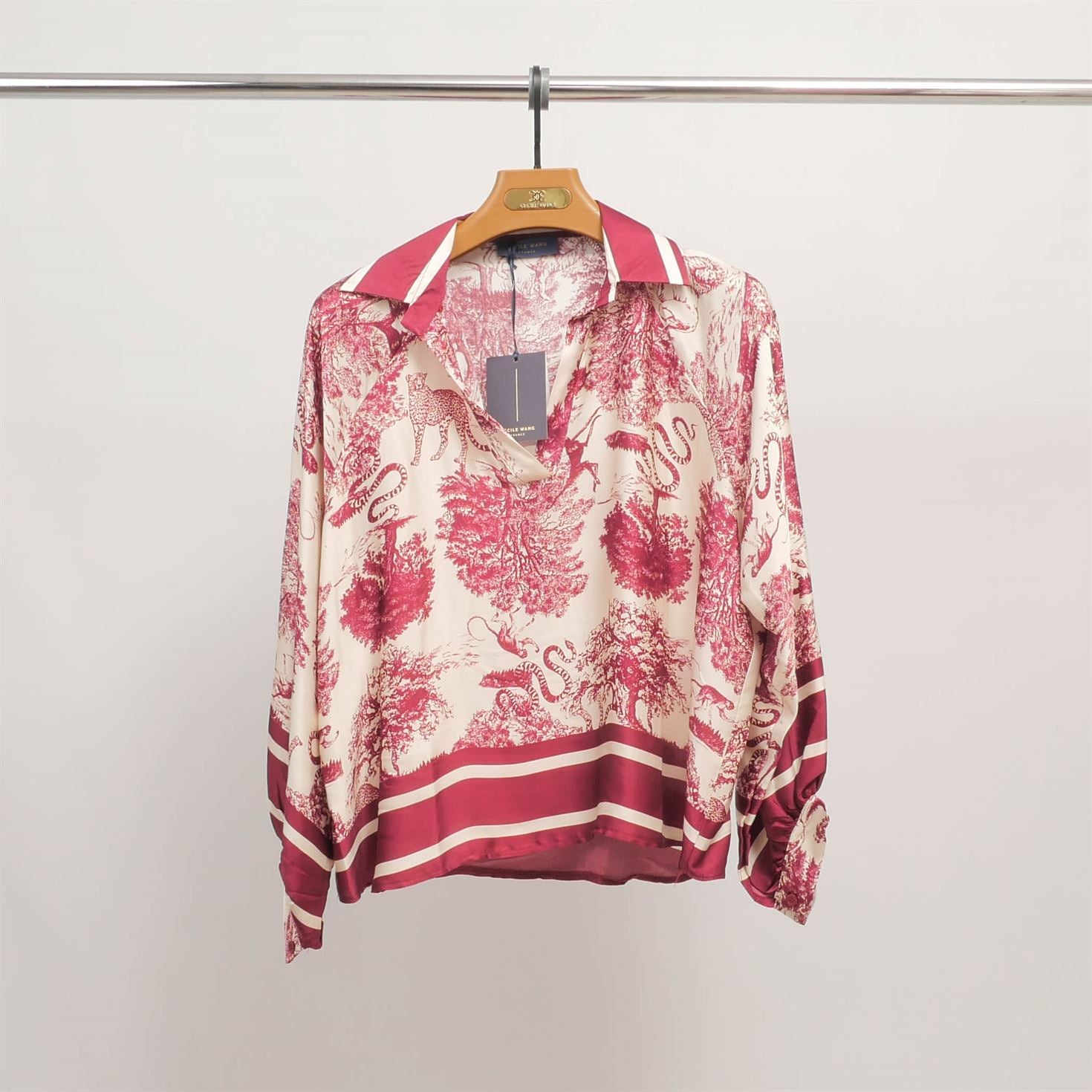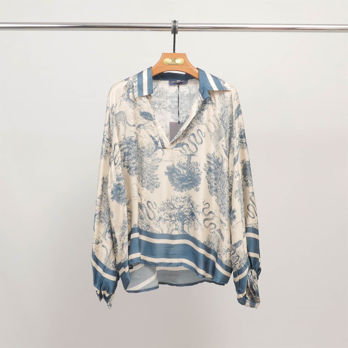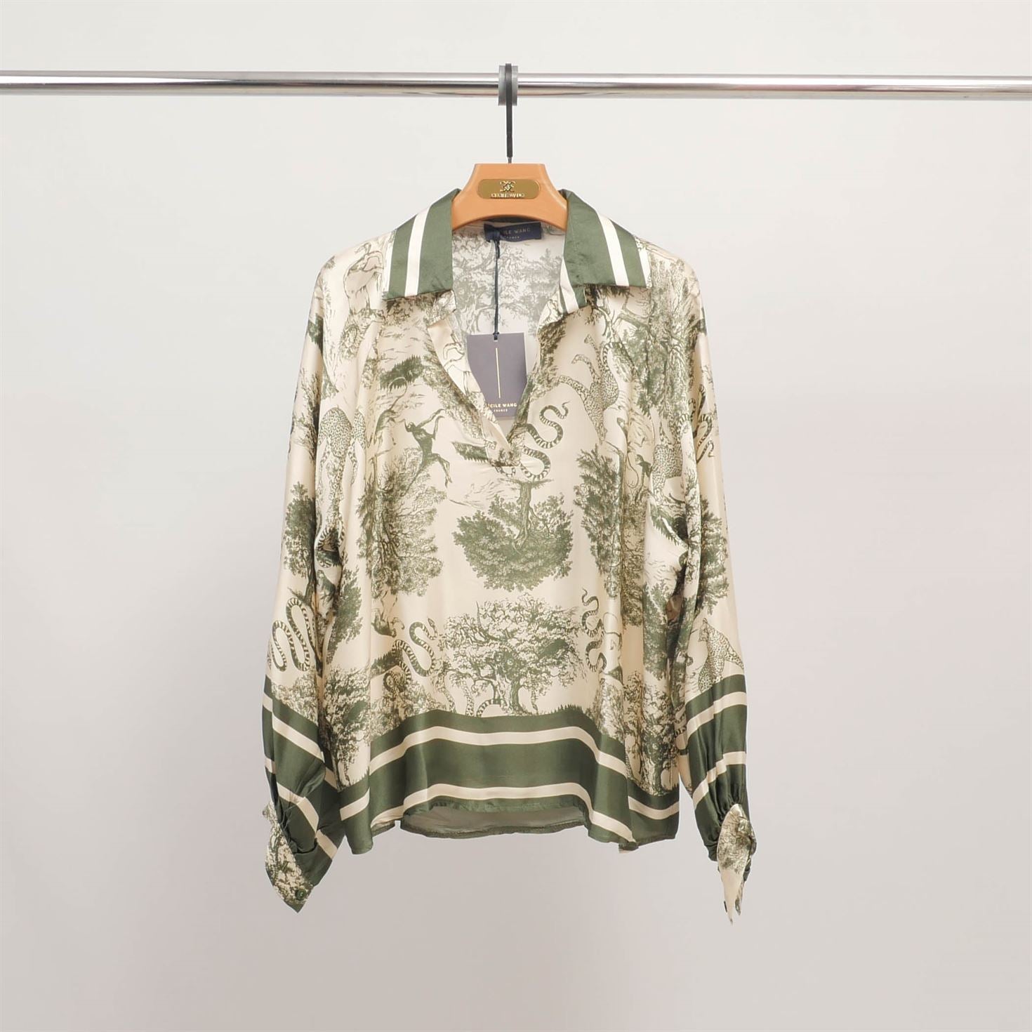 Un classique revisité avec raffinement et caractère. Cette tunique fluide séduit par son imprimé jungle façon toile de Jouy, mettant en scène une faune sauvage élégante – panthères, serpents, oiseaux – nichée au cœur d’un décor végétal délicat. Dotée d’un col chemise contrasté, d’une encolure tunisienne et de poignets boutonnés, elle combine confort et sophistication dans une coupe ample et féminine. À associer avec un pantalon droit ou une jupe fluide pour une allure à la fois naturelle et sophistiquée.
