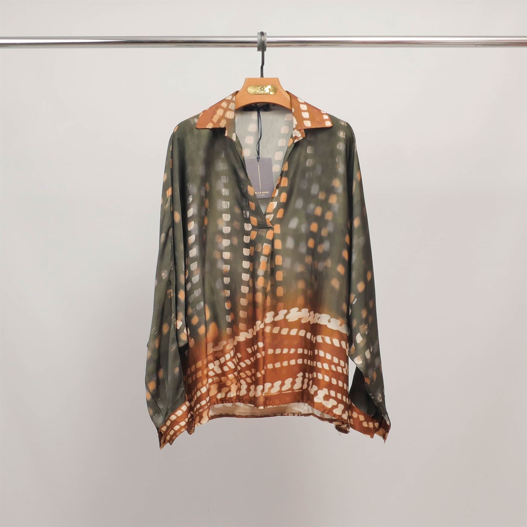 Apportez une touche d'élégance graphique à votre vestiaire avec cette tunique fluide à imprimé lumineux. Dotée d’un col ouvert flatteur et d’une encolure en V, elle séduit par sa silhouette ample et aérienne, idéale pour une allure décontractée mais sophistiquée. Les manches longues légèrement chauve-souris apportent du mouvement, tandis que l’imprimé géométrique décliné en plusieurs tonalités évoque une élégance contemporaine. Sa coupe fluide épouse le corps sans le contraindre et le tissu léger assure un tombé naturel et raffiné.