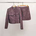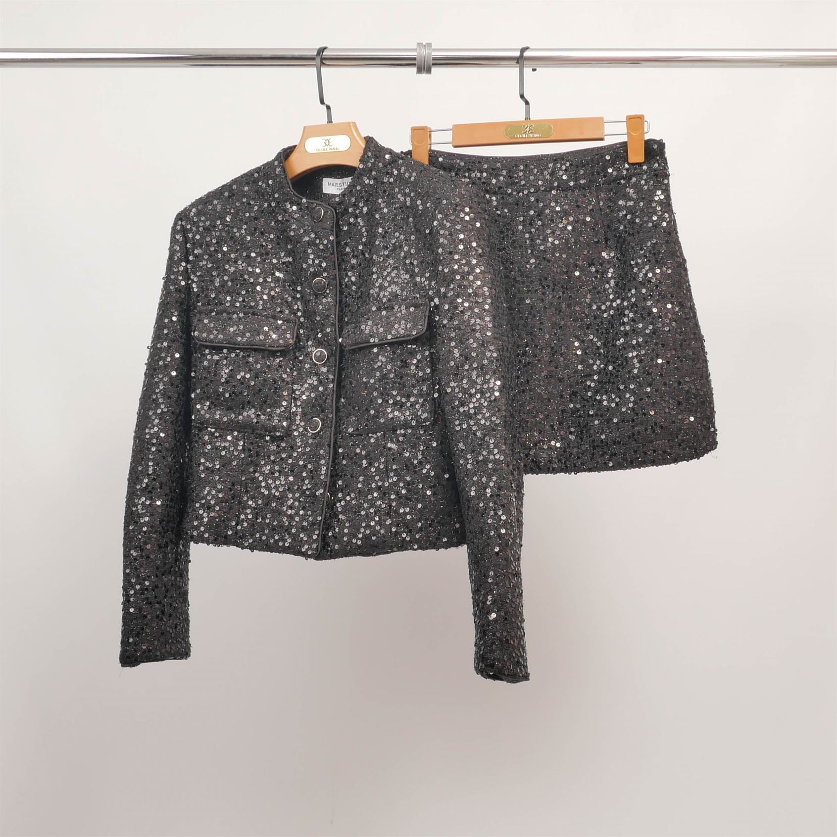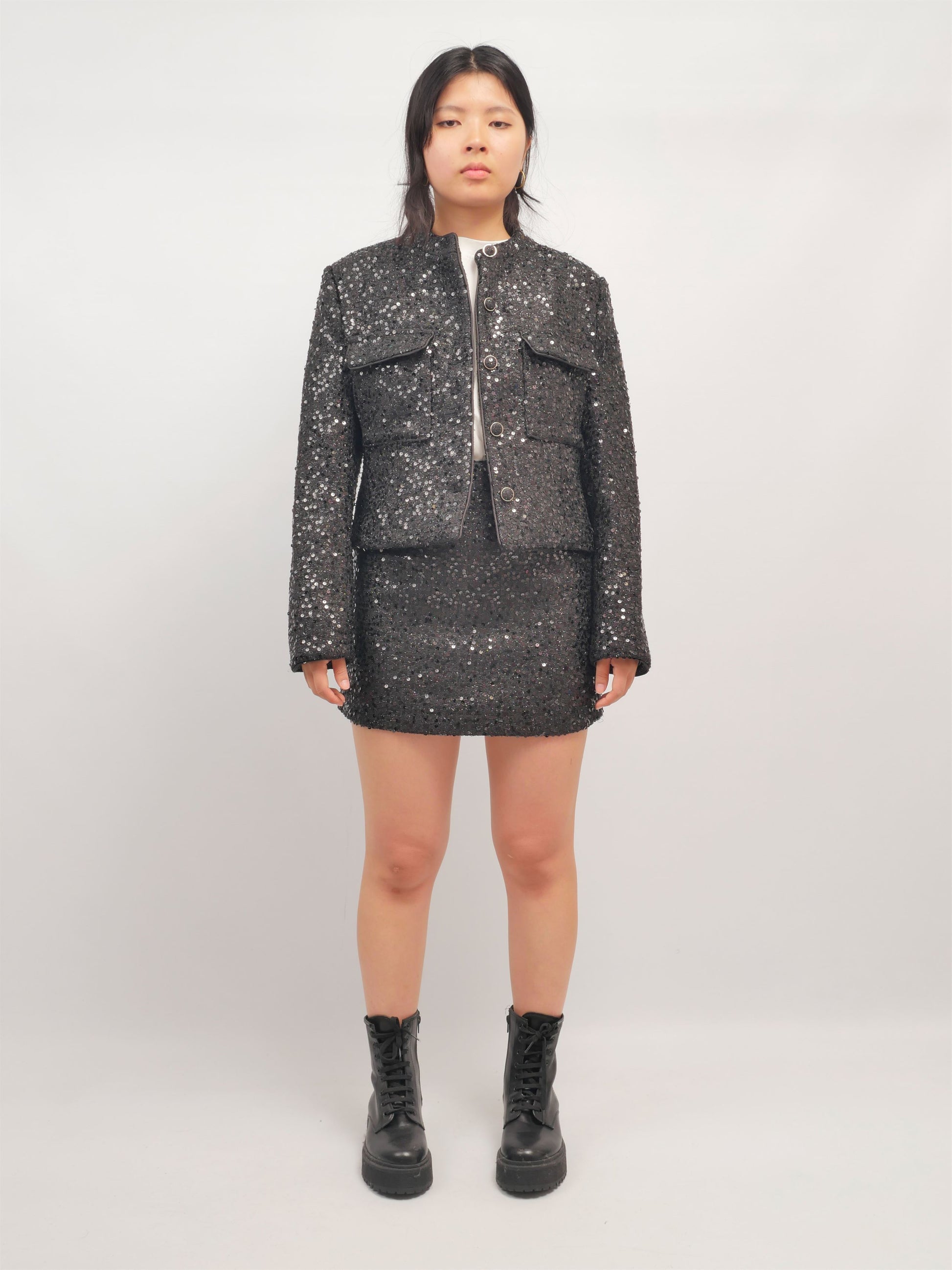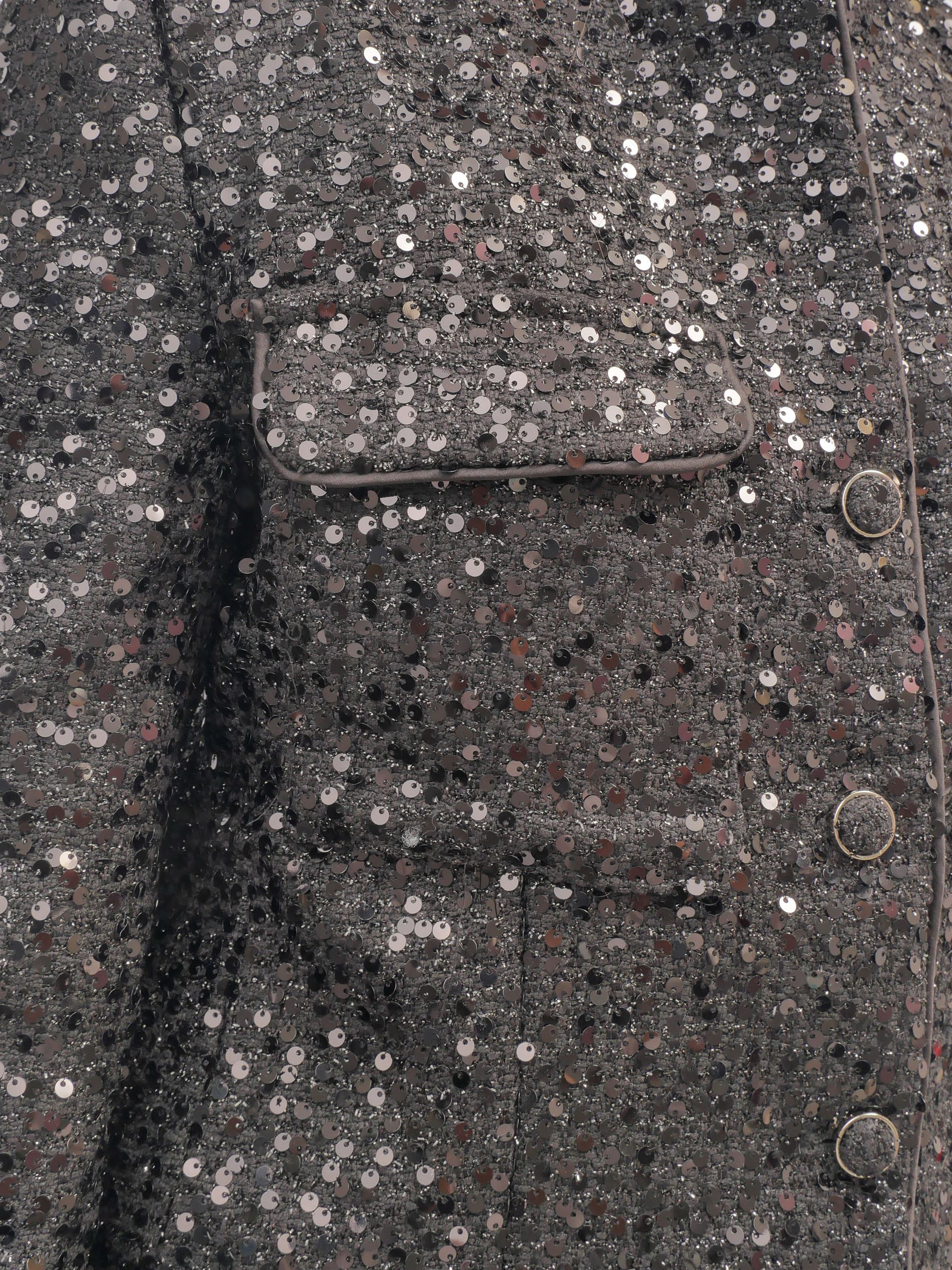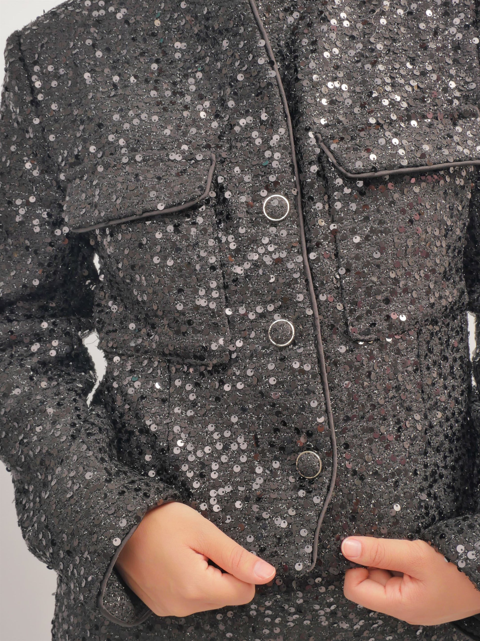 Cette veste courte séduit par son design structuré, sublimé d’une pluie de sequins ton sur ton qui accroche la lumière à chaque mouvement. Dotée d’un col officier élégant et de quatre poches à rabat décoratives, elle se ferme par une rangée de boutons recouverts pour une finition raffinée. Sa coupe droite et légèrement ajustée met en valeur la silhouette tout en assurant un porté confortable. Associez-la à la jupe assortie pour un total look festif, ou cassez son éclat avec un jean brut et des bottines pour une allure plus casual.