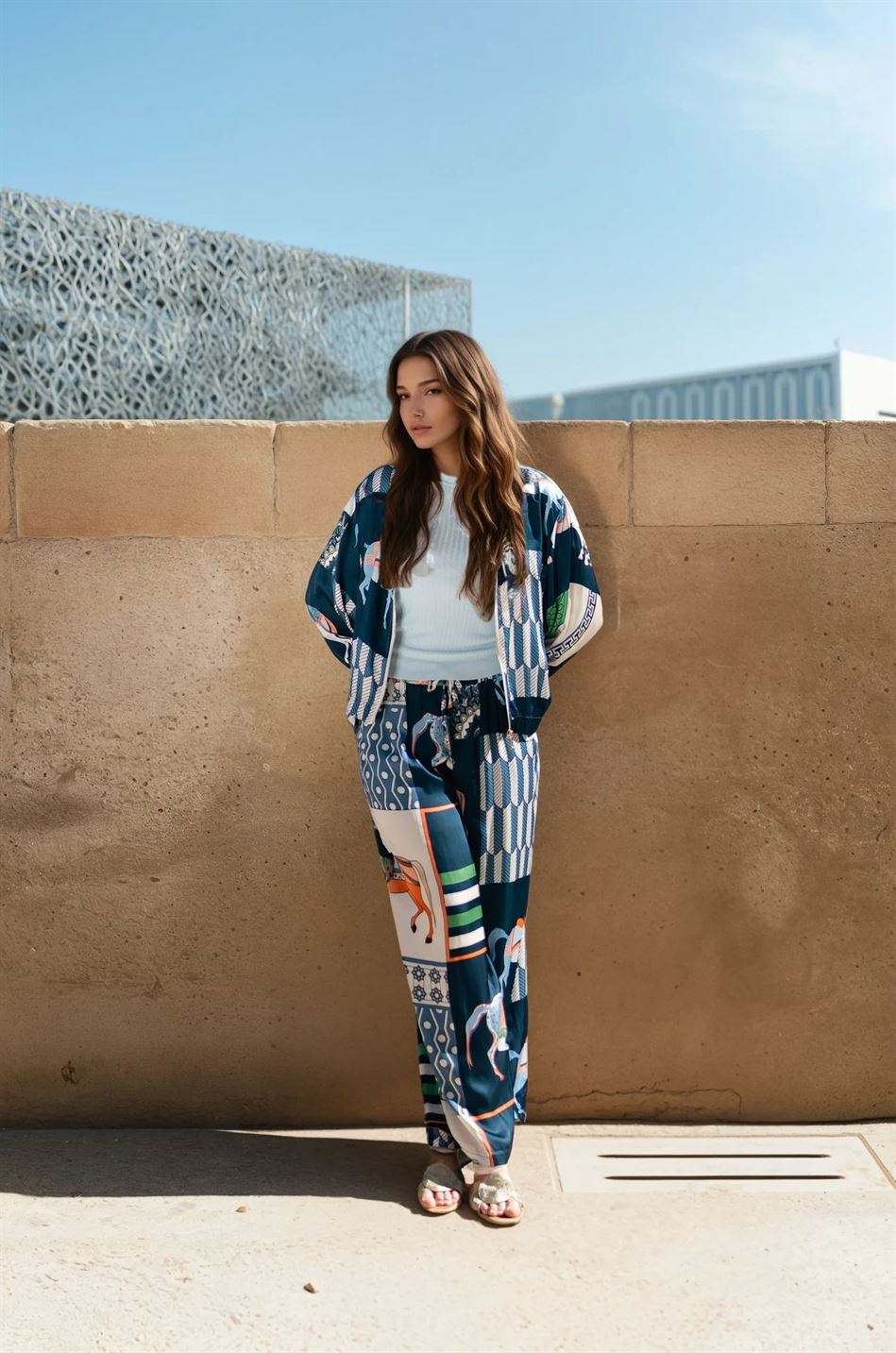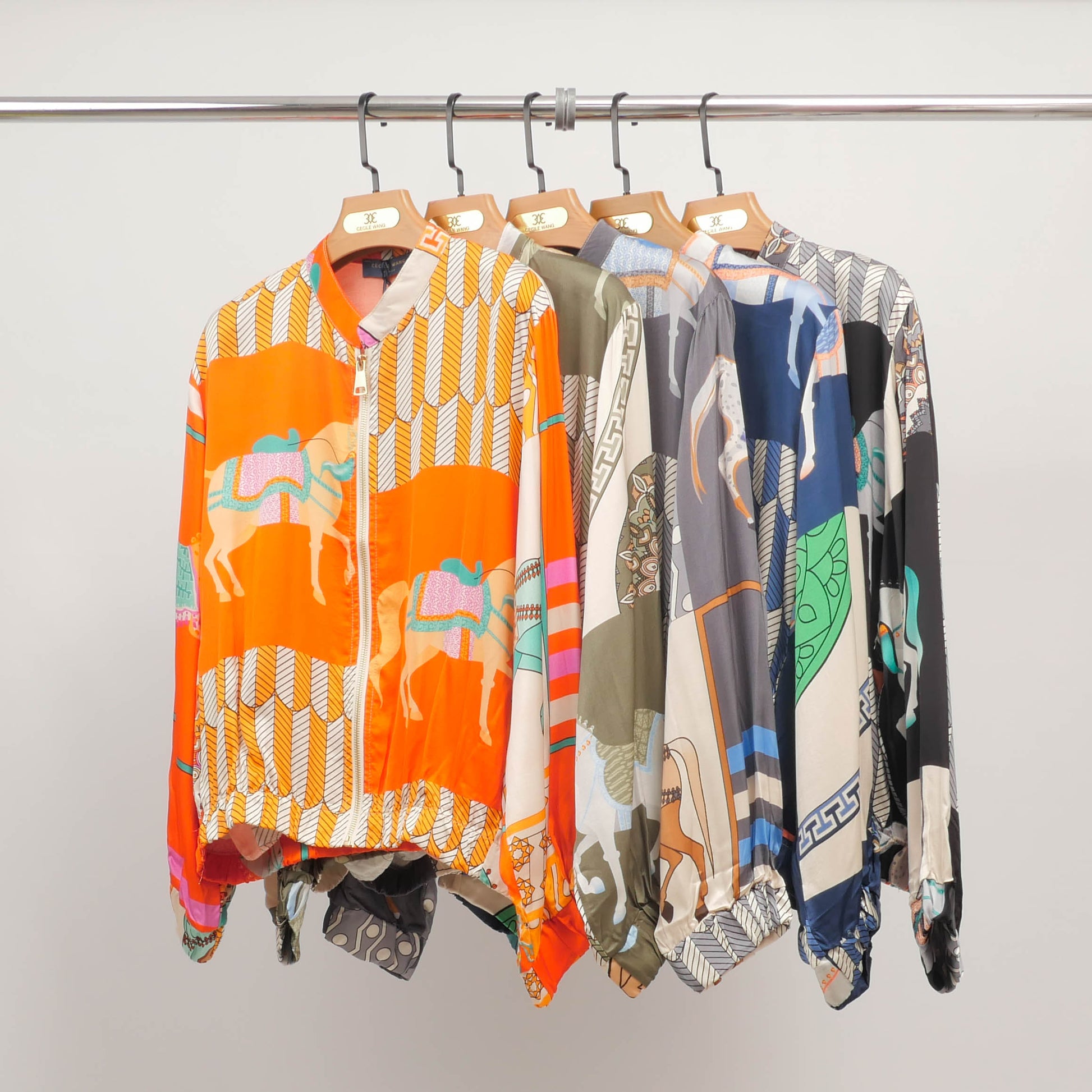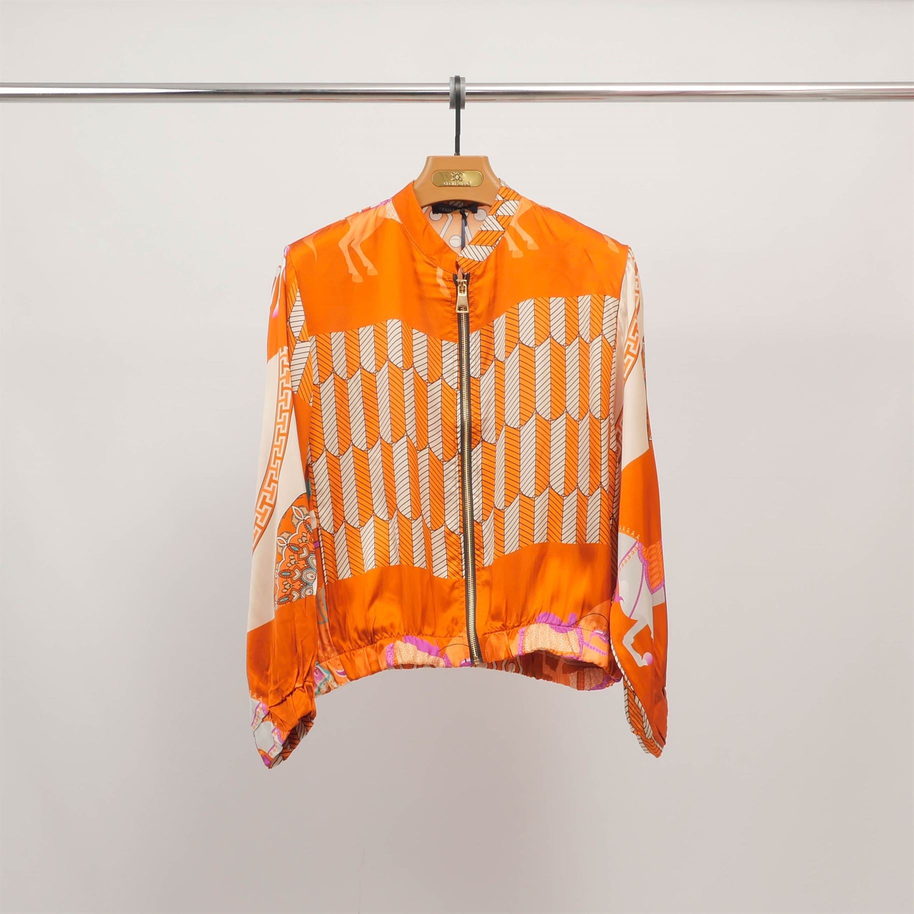 Une pièce forte qui allie audace visuelle et raffinement textile. Cette veste zippée se distingue par son imprimé équestre spectaculaire décliné en plusieurs nuances captivantes, apportant une touche artistique et élégante à votre vestiaire. Confectionnée dans une matière fluide au tombé souple, elle présente une coupe décontractée légèrement blousante à la taille, avec col rond, fermeture zippée discrète et finitions soignées aux poignets.