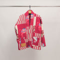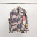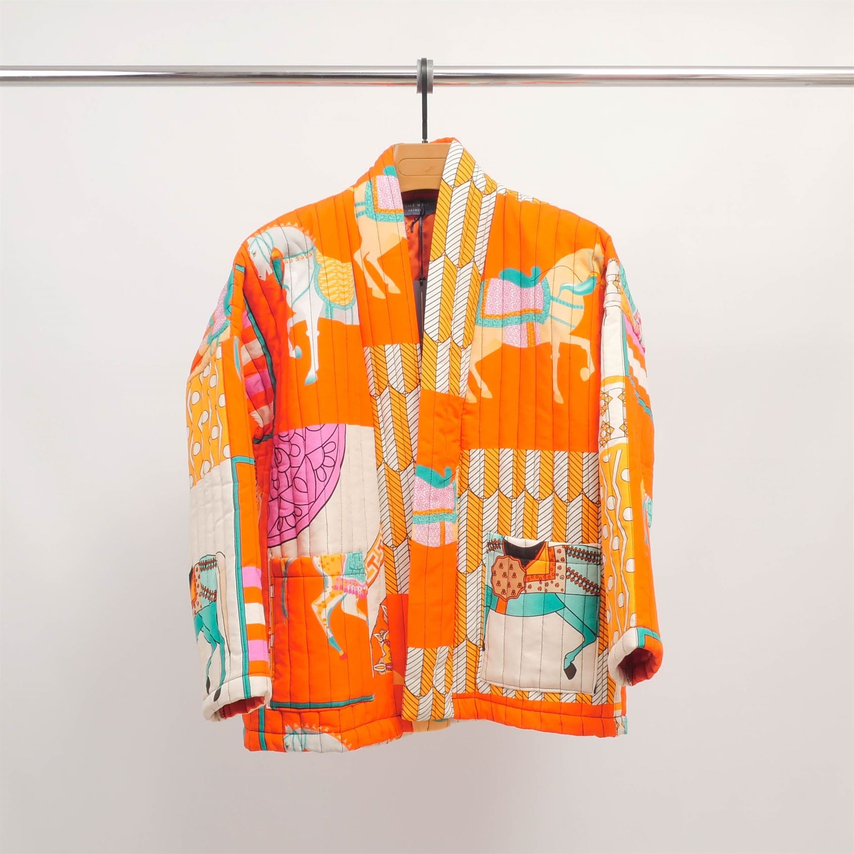 Cette veste matelassée façon kimono réinvente l’élégance graphique avec un imprimé patchwork saisissant de chevaux stylisés et de motifs géométriques. Sa coupe ample à manches longues et son col châle lui confèrent une allure décontractée et contemporaine, idéale en superposition. Dotée de deux poches plaquées et d’une structure souple, elle marie confort et originalité. Confectionnée dans un tissu doux et légèrement ouaté, elle assure chaleur légère et style affirmé. À porter ouverte sur une tenue monochrome pour un look audacieux ou ceinturée pour structurer la silhouette.