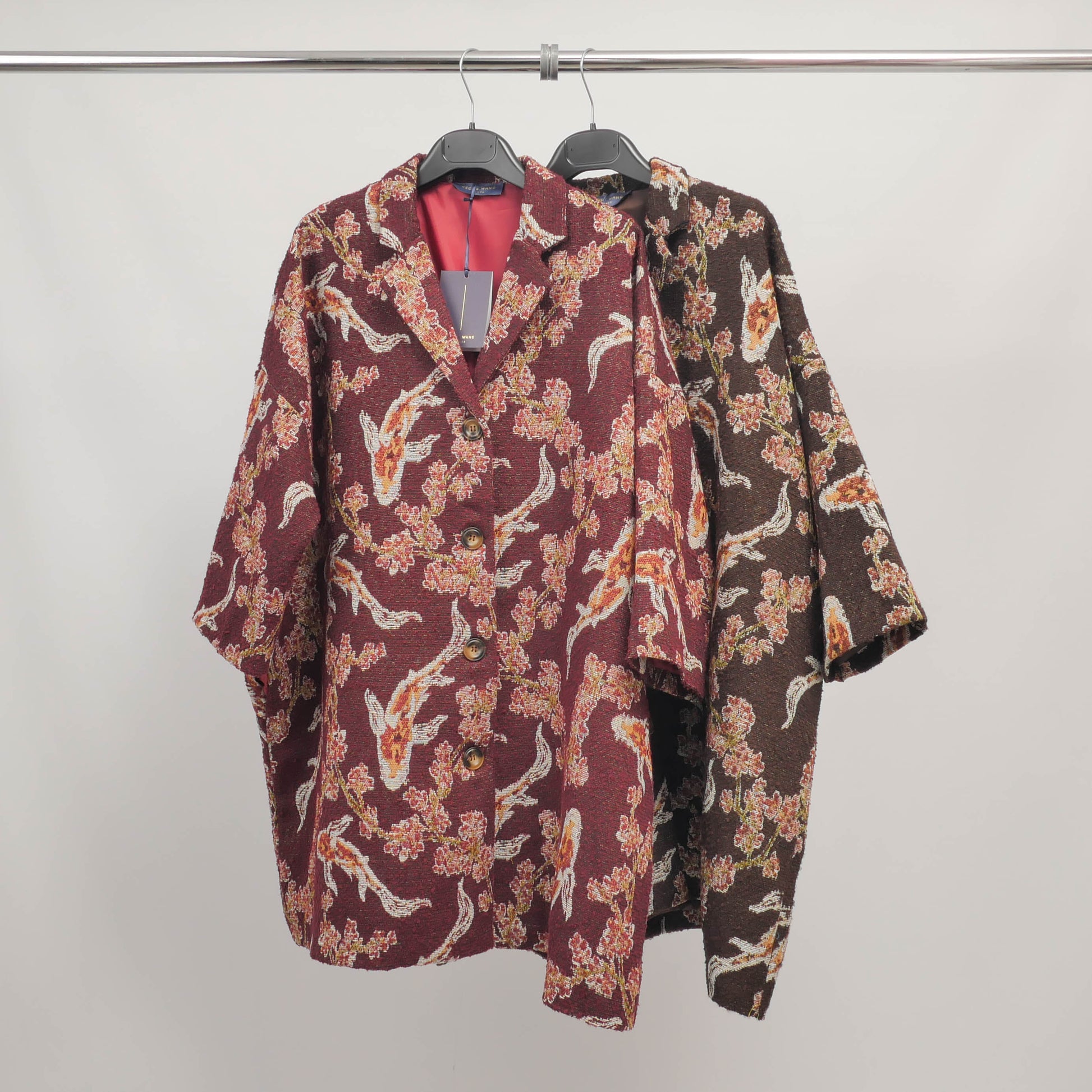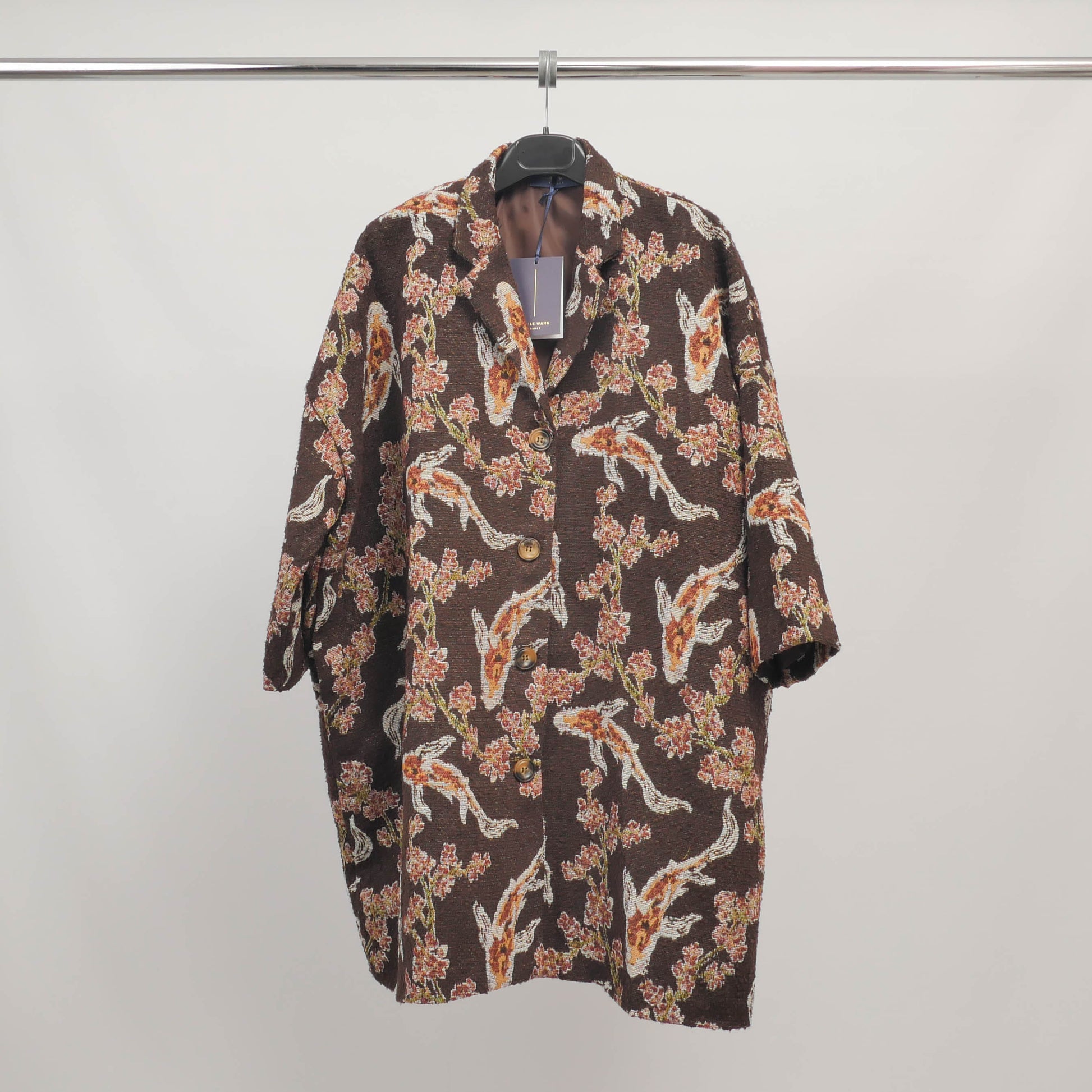Osez une pièce forte et poétique avec cette veste longue à l’élégant motif brodé de carpes koï et fleurs japonisantes. Confectionnée dans un jacquard texturé riche en détails, elle allie originalité et raffinement dans un esprit kimono revisité. Sa coupe oversize, ses manches amples et son boutonnage sur le devant en font une pièce facile à superposer pour un look structuré. Elle apporte instantanément du caractère à une silhouette minimaliste, sur un pantalon cigarette ou une robe unie.