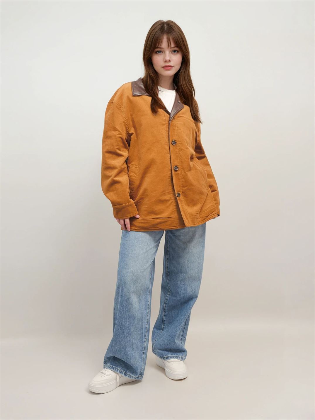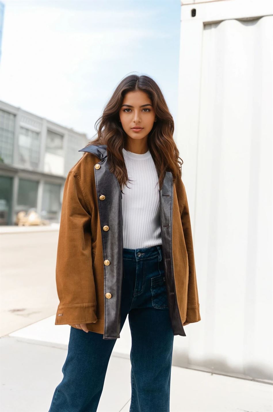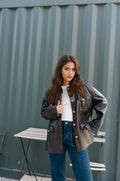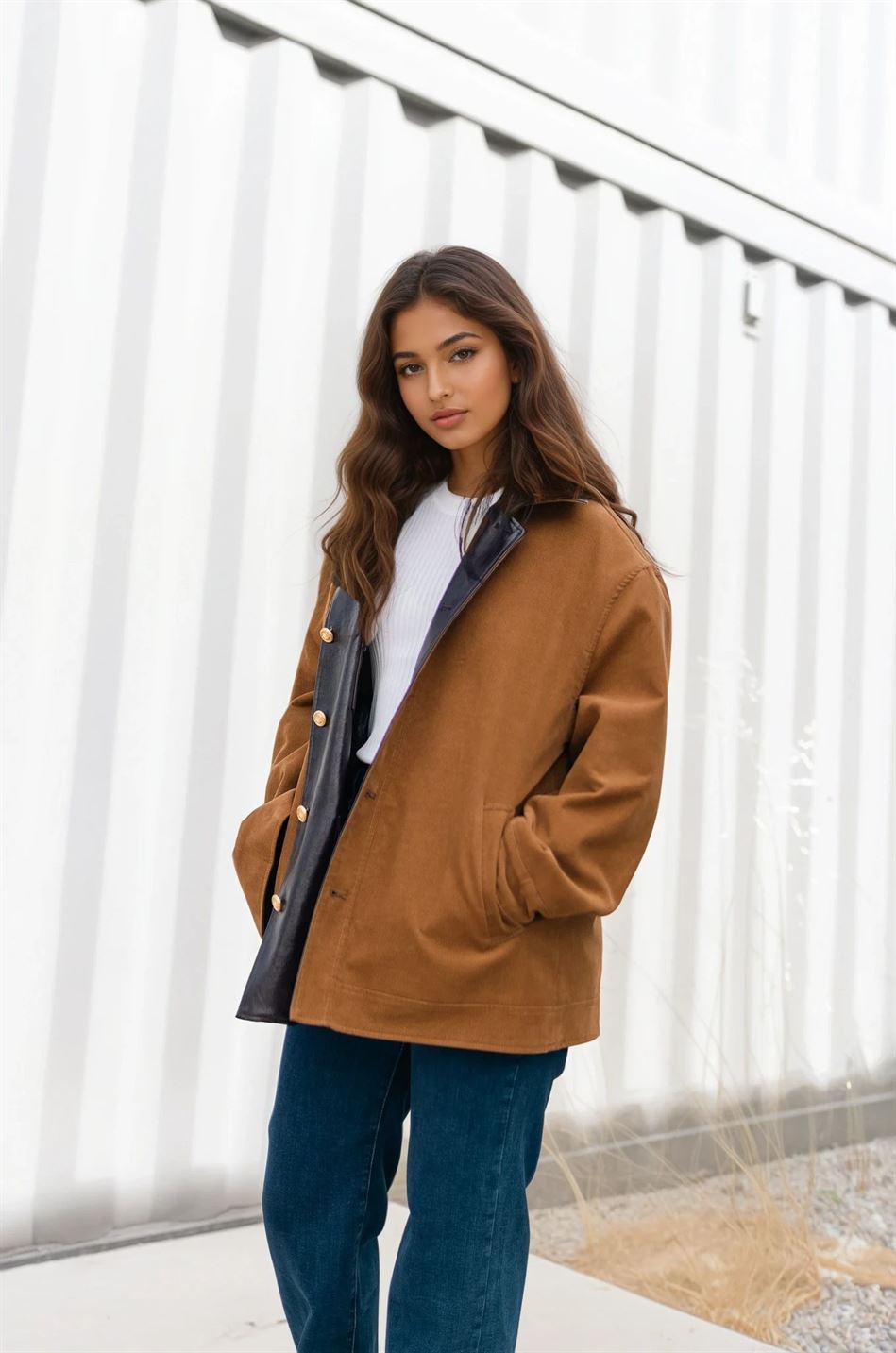 Une pièce deux-en-un qui allie praticité et style. Cette veste oversize est conçue en similicuir souple avec une belle finition brillante d’un côté, et en suédine douce à l’intérieur pour une allure plus casual et vintage. Grâce à son design réversible, elle se porte des deux côtés : le côté similicuir pour un look moderne et urbain, et le côté suédine pour une version plus décontractée et chaleureuse. Les boutons dorés et les poches à rabat ajoutent une touche d’élégance et de fonctionnalité. À associer aussi bien avec un jean qu’avec une robe pour varier les styles en toute simplicité.