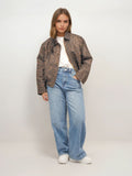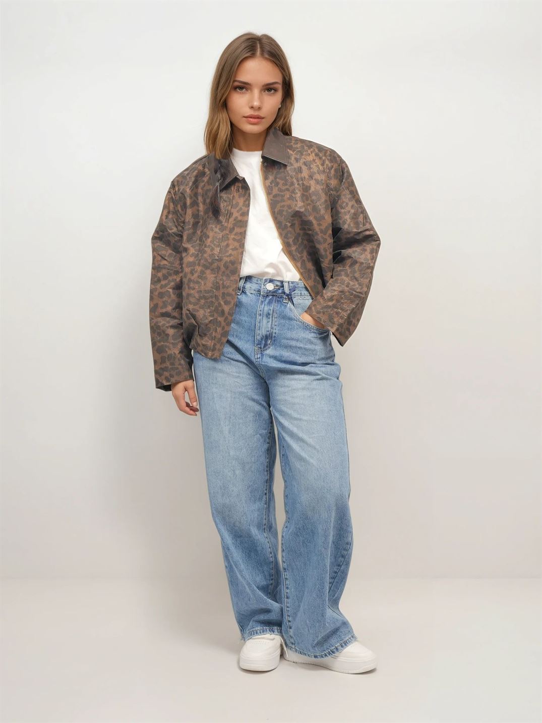Cette veste courte adopte une coupe droite et décontractée, sublimée par un motif léopard ton sur ton pour un effet visuel fort mais sophistiqué. Le tissu enduit légèrement brillant ajoute une texture originale et contemporaine, tandis que le col chemise rigide et la fermeture zippée dorée accentuent le côté urbain de la pièce. Légère et facile à superposer, elle se porte aussi bien ouverte que fermée. Associez-la à un jean brut ou un pantalon noir pour un look street-chic sans effort.